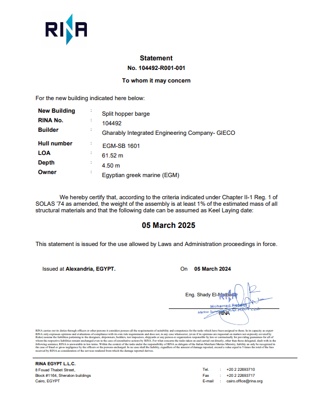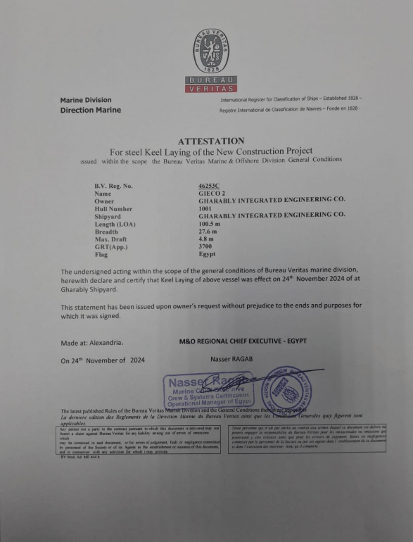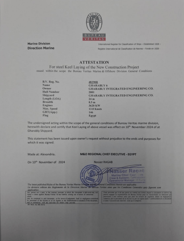 - This certificate confirms the official keel laying of the vessel at Gharably Shipyard, as verified by Bureau Veritas Marine Division. It records the vessel’s key specifications, ownership details, and the date of commencement of construction, serving as formal recognition of the shipbuilding milestone.