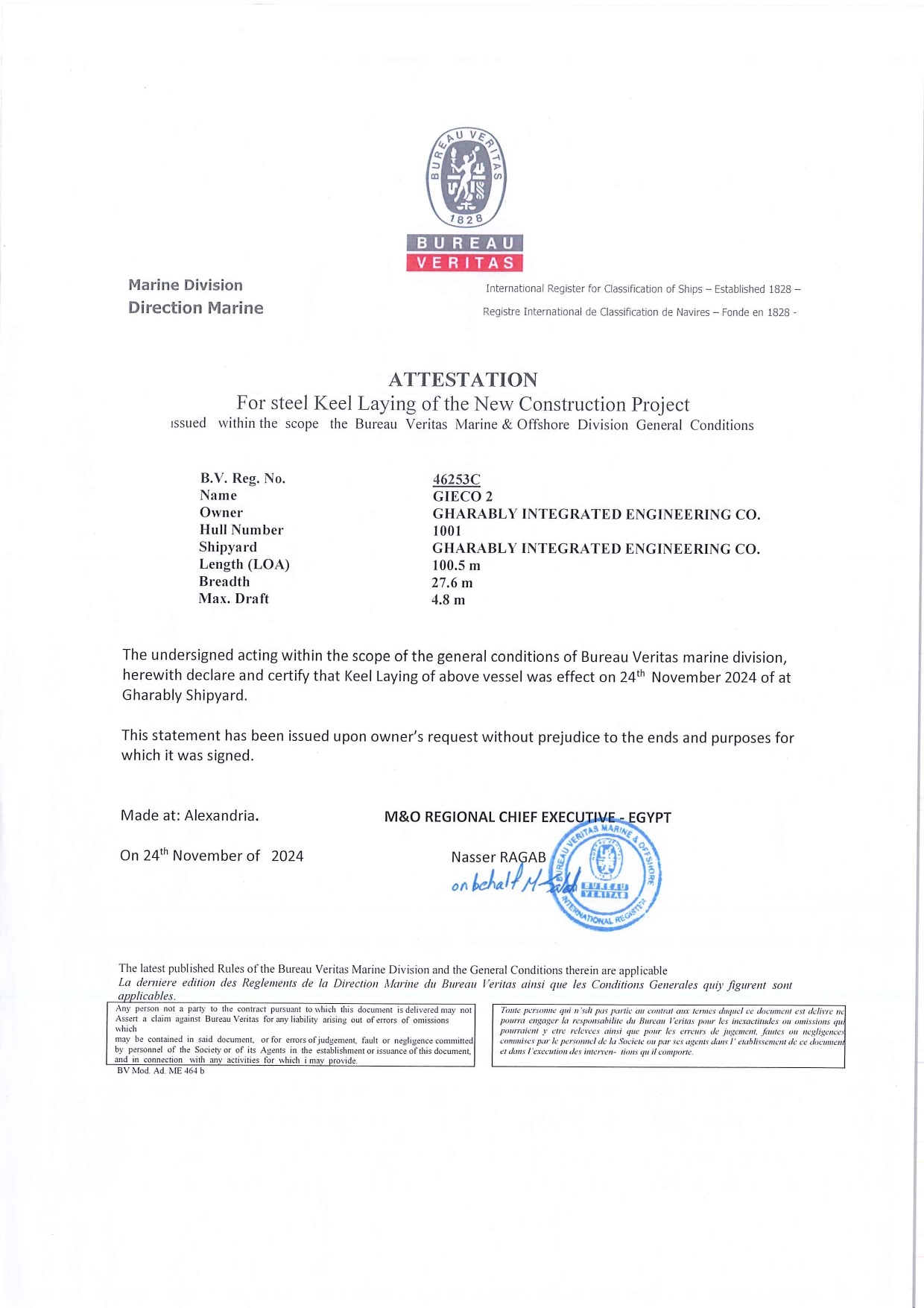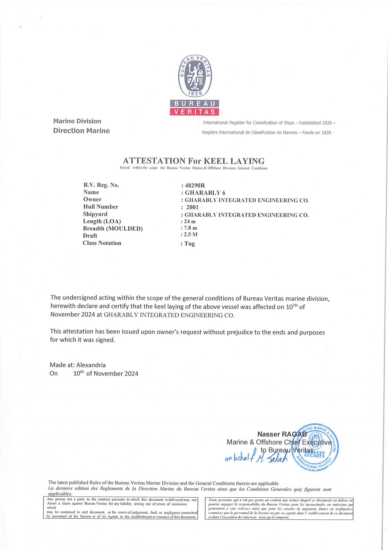 - This certificate confirms the official keel laying of the vessel at Gharably Shipyard, as verified by Bureau Veritas Marine Division. It records the vessel’s key specifications, ownership details, and the date of commencement of construction, serving as formal recognition of the shipbuilding milestone.