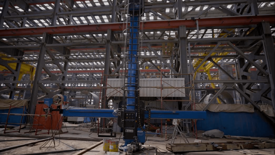 Three columns and a boom of 5 mx 5 m for circular welding of pipes.